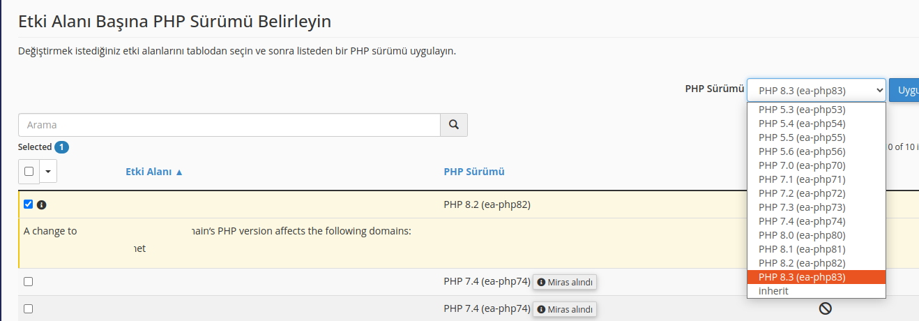 cPanel'de bulunan multiPHP Yöneticisi sayfasında sağ alanda bulunan listeden kullanılabilir olan PHP sürümlerini göreceksiniz. Genellikle en son sürümler ve eski stabil sürümler listelenir. İhtiyacınıza uygun olan sürümü seçin.